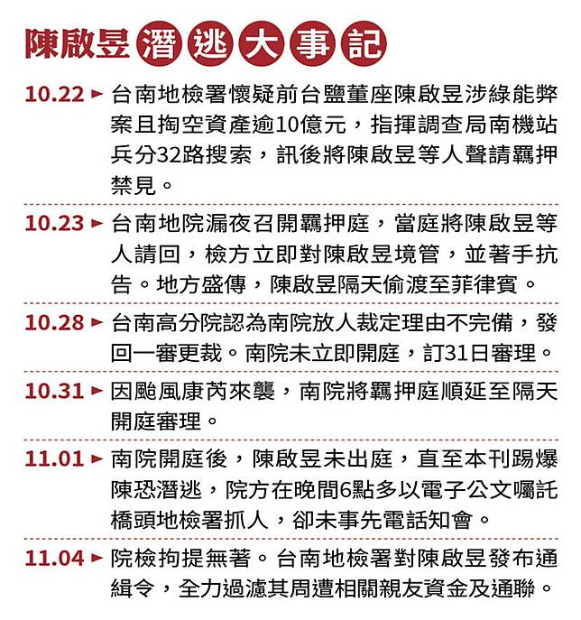 台鹽前董事長陳啟昱涉嫌掏空公司遭通緝,台南地方法院日前重開羈押庭時他已人間蒸發,坊間盛傳他獲無保請回隔天,就從高雄林園海邊偷渡菲律賓,近日更盛傳他經常出入當地賭場。